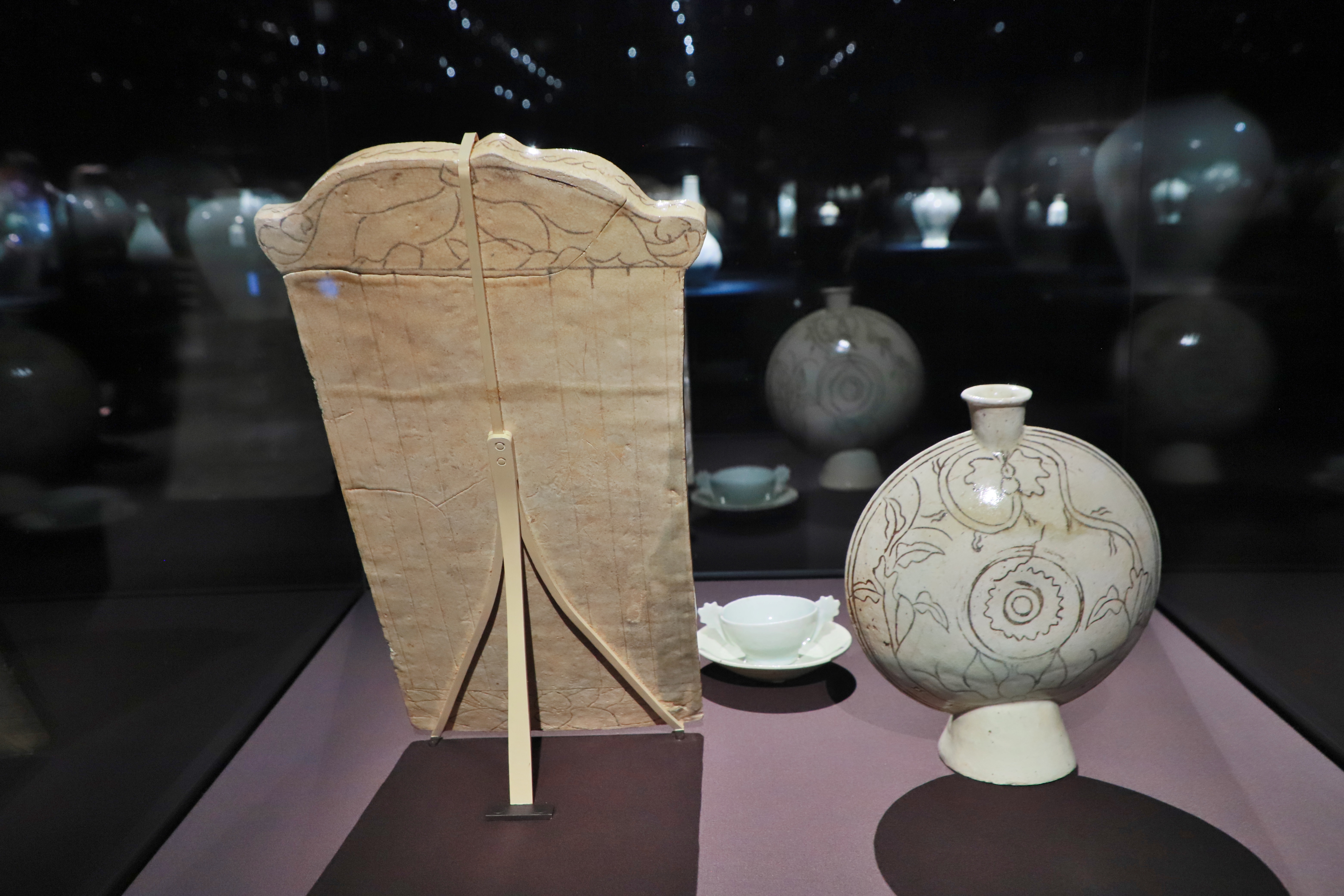 1974년 국보로 지정되었다. 백자상감 꽃무늬 플랫병(하얀색자기) 높이 22.1cm, 백자상감묘지(하얀색자기) 길이 15″, 폭 8″. 삼성미술관 리움.