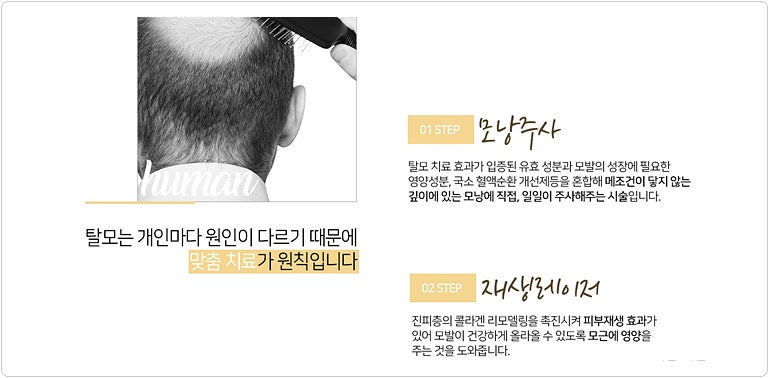 효과는 두피의 혈액순환을 촉진시키면서 모발의 성장을 돕고 모낭을 강화시켜 모발이 잘 빠지지 않도록 돕는 치료입니다. 모낭에 직접 유효성분이 주입되기 때문에 모낭의 성장이 촉진되는 것은 물론 모낭경 내 세포 활성화가 이루어져 모낭은 이전보다 튼튼하고 튼튼해질 수 있습니다.