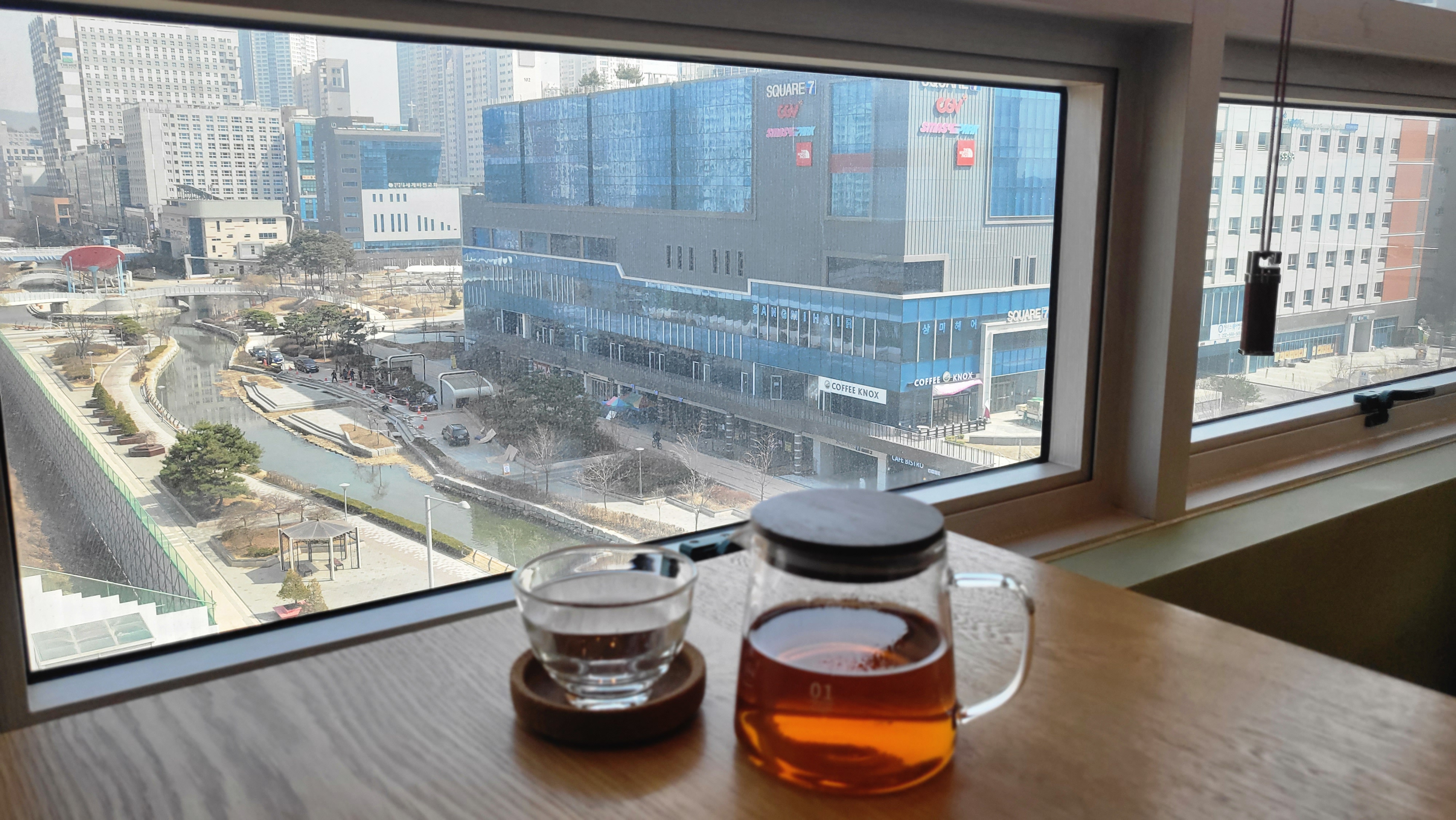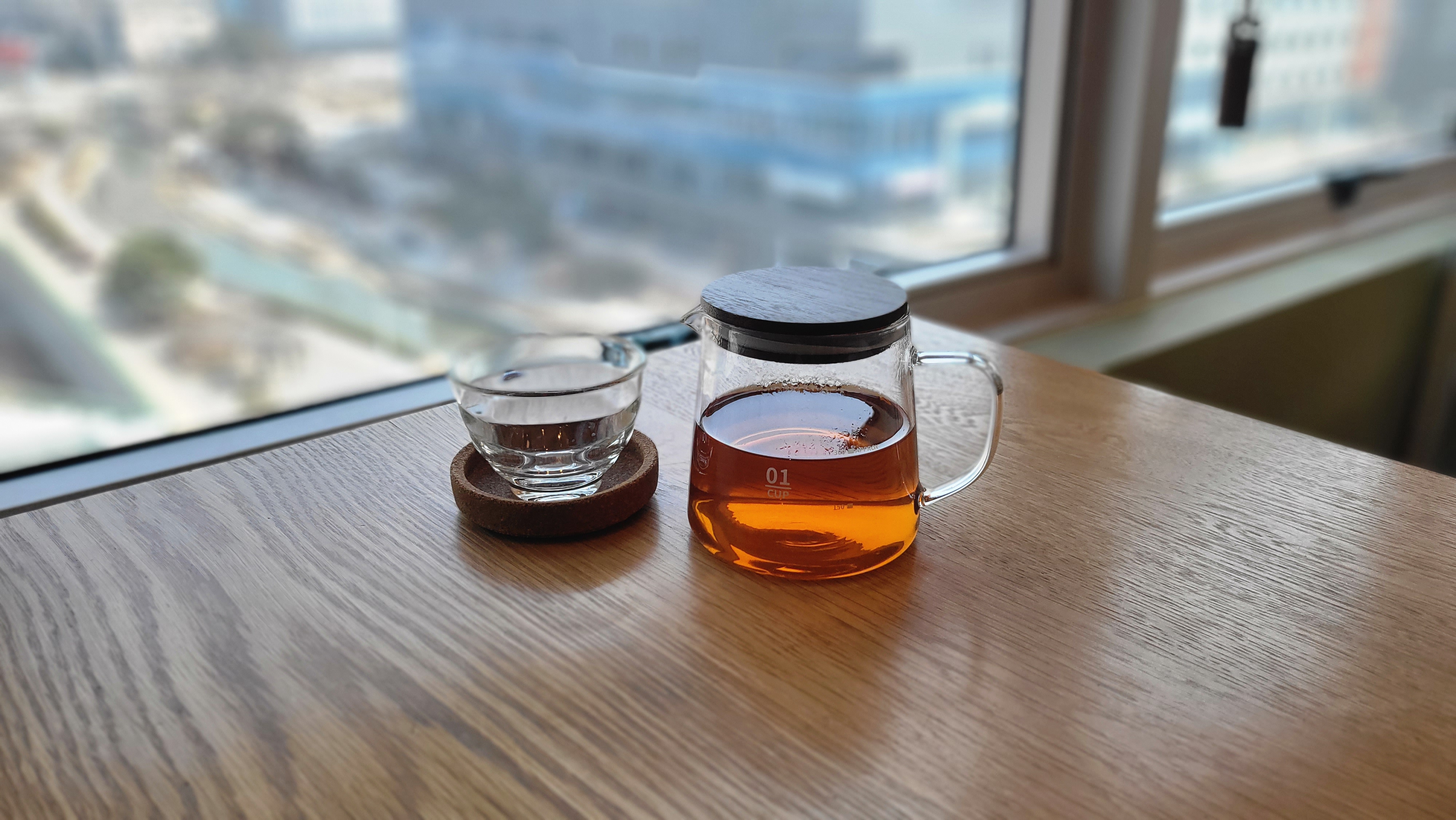 창밖을 바라보며 즐기는 따뜻한 차 한잔