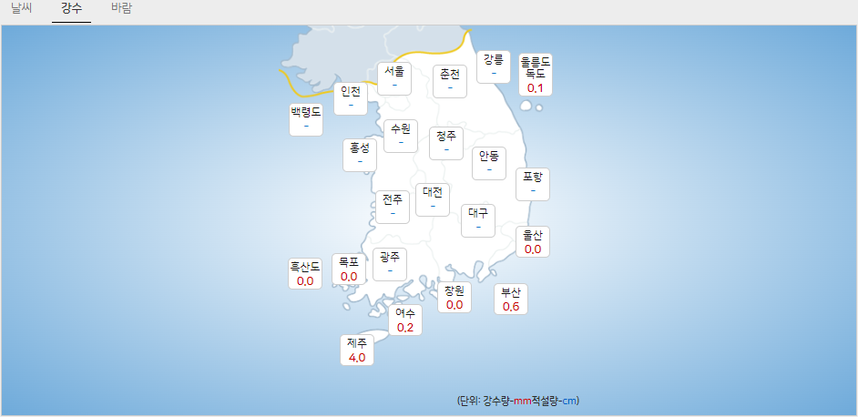 (강우량) 오늘(1일) 저녁(18-21:00)과 내일(2일) 오전(06-09:00) 사이 울릉도. 독도는 비가 오나 눈이 오나.
